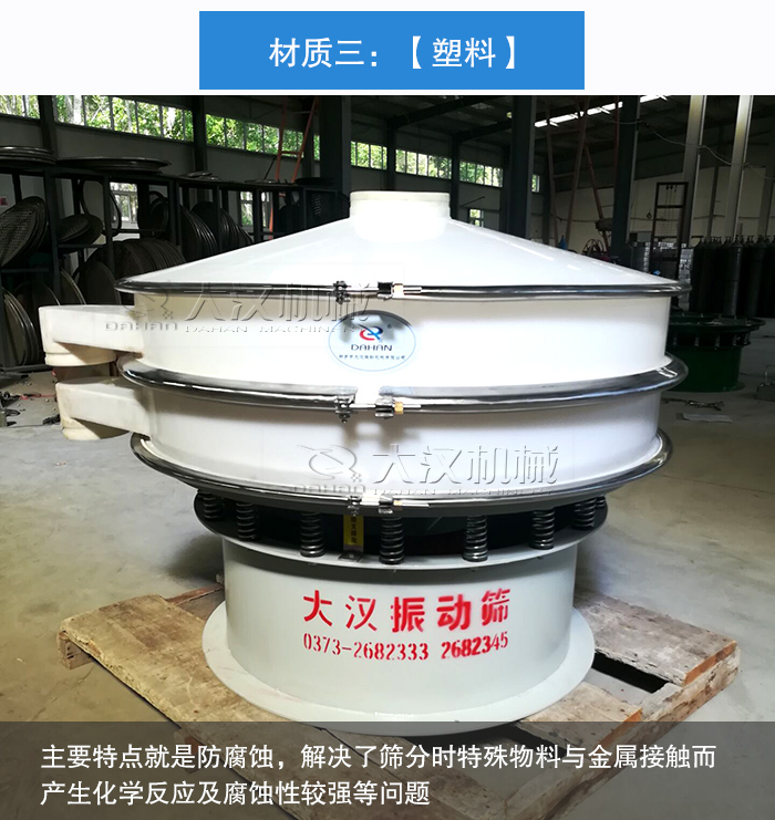 塑料振動篩的結構主要是【塑料+碳鋼(與物料接觸部分為塑料)】它主要特點就是防腐蝕,解決了篩分時特殊物料與金屬接觸而產生化學反應及腐蝕性較強等問題。接觸物料部位從篩框、篩網、中框、密封蓋和清網裝置等完全采用非金屬材料,完全排除了一些特殊物料與金屬接觸會產生化學反應等問題。塑料振動篩適用于化工、醫藥、軍工等特種行業干粉或漿液類物料篩分過濾作業。