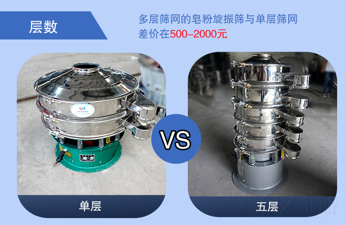 皂粉旋振篩可安裝1-5層篩網,同時進行2~6個等級的皂粉篩分、過濾、分級、除雜,可根據不同的篩分需求安裝不同層數的篩網,安裝多層篩網的皂粉旋振篩肯定會比單層篩網的要貴一些,他們的差價在500-2000元左右。具體的層數選擇就是要根據您的篩分目的來決定。